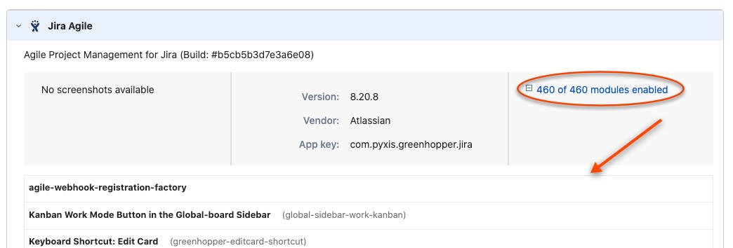 Click on modules enabled & locate greenhopper-agile-issue-web-panel