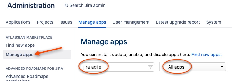 Locate JIRA Agile plugin in "All apps" and click on it to expand.