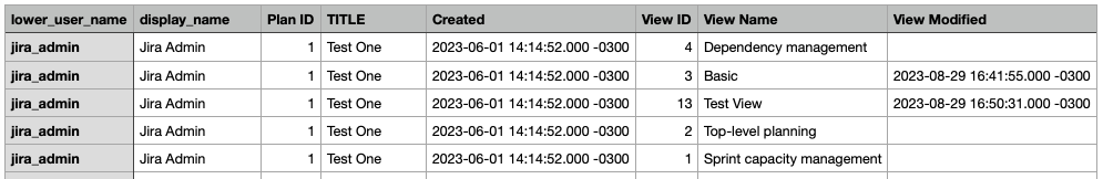 Also note that, if the plan was created with Portfolio 2.5 (now known as Advanced Roadmaps) or older versions, the following query might not produce correct results, as in those older versions, there was no CREATED_TIMESTAMP in the AO_D9132D_PLAN table and the AO_D9132D_SAVED_VIEW2 table did not even exist.