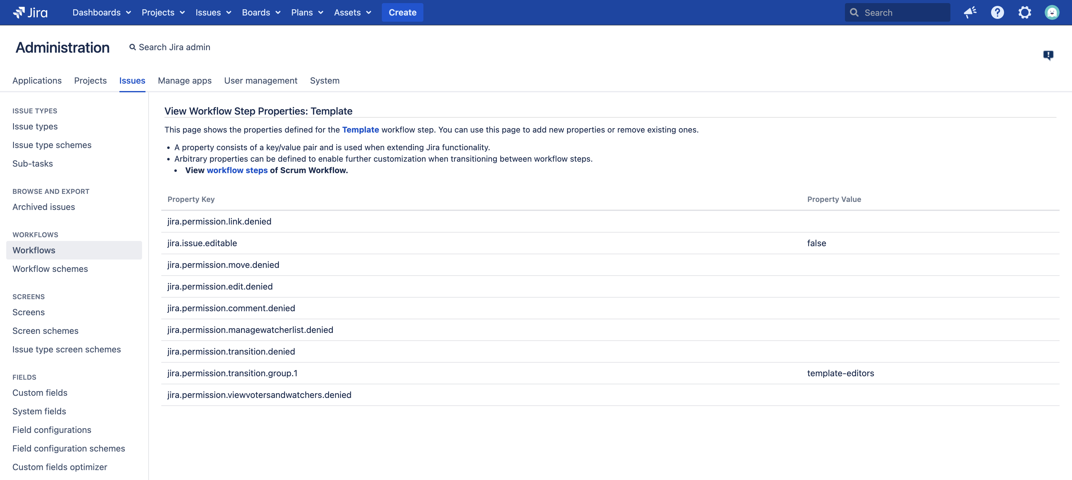 If you get an error 500 message while loading an issue using this workflow, then you've entered an invalid property key or value. Check the atlassian-jira.log file for more details.