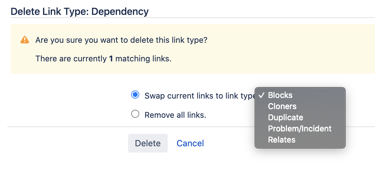 In this case, proceed with deleting the duplicate link type. You will be prompted to swap it: