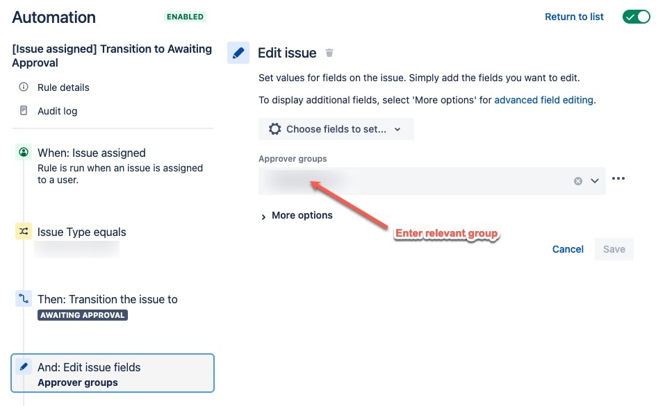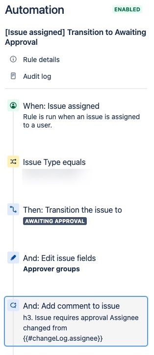 The automation will trigger when an issue is assigned to a user, if the issue type is equal to what is configured in the conditions then it will transition the issue to Awaiting approval, set the Approver groups field to the relevant group and add a comment to the issue notifying whom the previous and current assignees are.