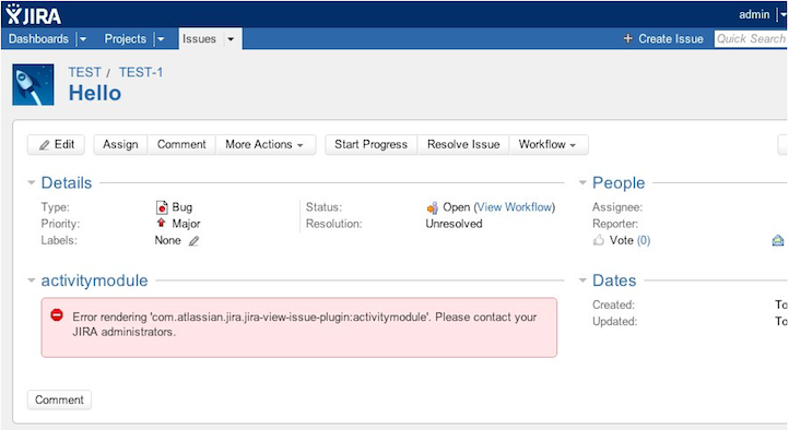 After upgrading JIRA Fisheye plugin to the latest version, 5.2.1, issues activity module is no longer showing up properly. Hence, issue comments, changes histories, activities becomes inaccessible. Sample screenshot of the problem: