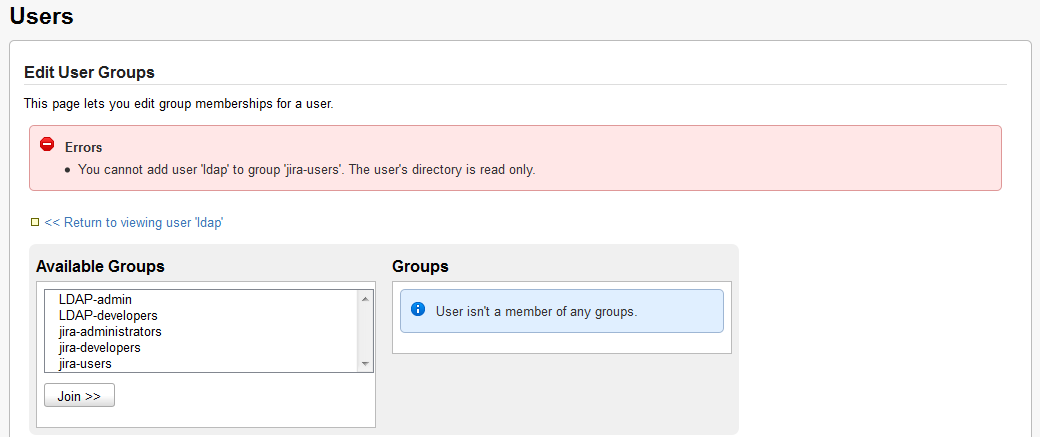 You have configured an internal directory and an LDAP directory with the permission "Read Only, with Local Groups" where you have configured the default group membership to be "jira-users". Configuration was successful and synchronization was without any problem. When you try to login as an LDAP user, it fails with the error "You do not have a permission to log in. If you think this is incorrect, please contact your JIRA administrators." When you try to associate the user with the jira-users group from the UI, you are faced with the error "You cannot add user 'xxxx' to group 'xxxxxx'. The user's directory is read only."