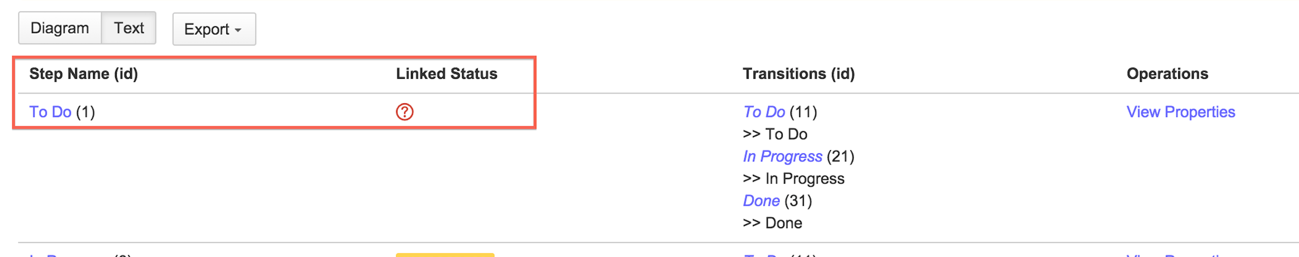 <step id="6" name="In Progress"> <meta name="jira.status.id">3</meta> </step>ℹ️Replace the {STATUS_In Progress} with the correct ID of the missing Status. In this case, In Progress' ID is 3