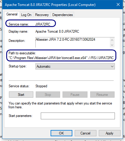 JIRA_Install/binand run this command to register a new service:service.bat install AnyUniqueServiceNameThis will register a new JIRA service pointing to the executable Tomcat 8 (as in the above image)