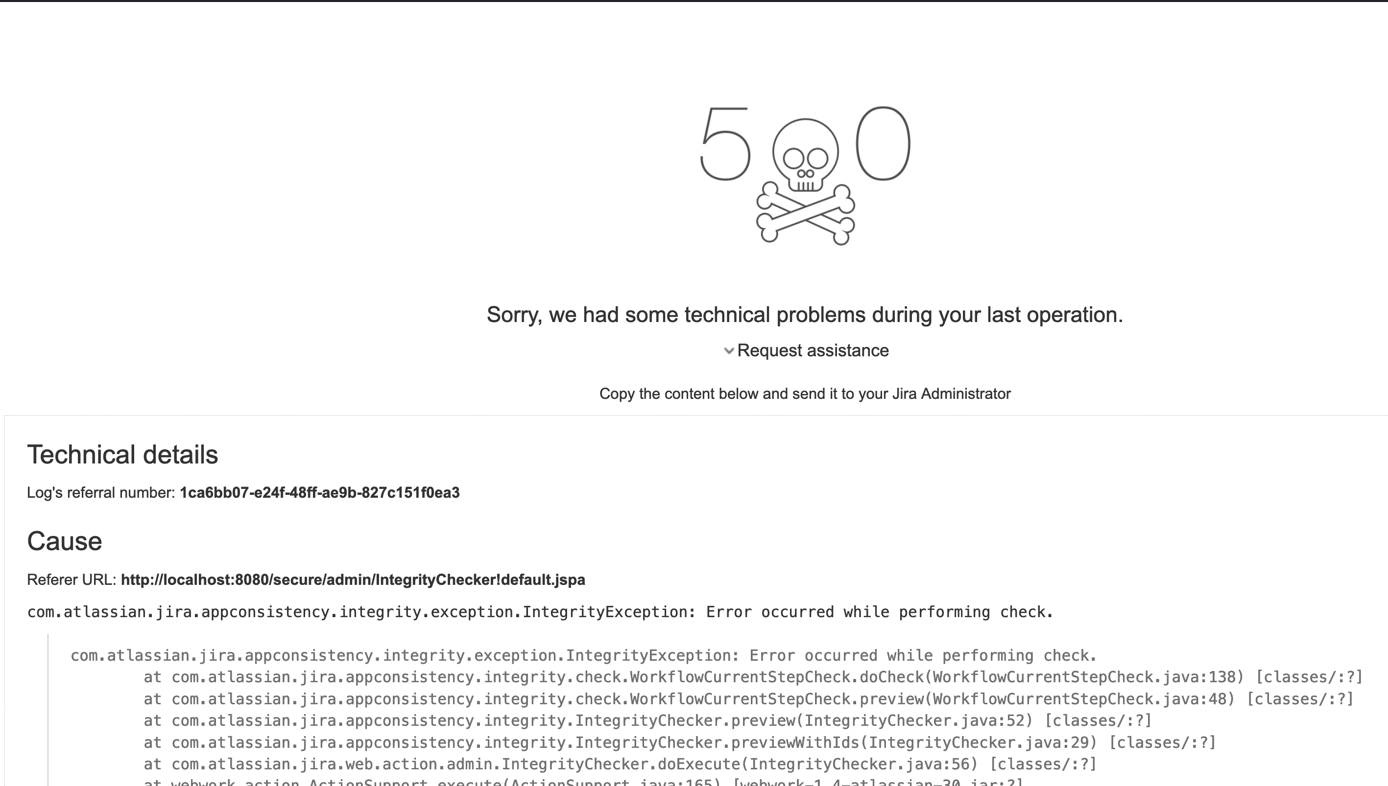 com.atlassian.jira.appconsistency.integrity.exception.IntegrityException: Error occurred while performing check. at com.atlassian.jira.appconsistency.integrity.check.WorkflowCurrentStepCheck.doCheck(WorkflowCurrentStepCheck.java:138) [classes/:?] at com.atlassian.jira.appconsistency.integrity.check.WorkflowCurrentStepCheck.preview(WorkflowCurrentStepCheck.java:48) [classes/:?] at com.atlassian.jira.appconsistency.integrity.IntegrityChecker.preview(IntegrityChecker.java:52) [classes/:?] at com.atlassian.jira.appconsistency.integrity.IntegrityChecker.previewWithIds(IntegrityChecker.java:29) [classes/:?]