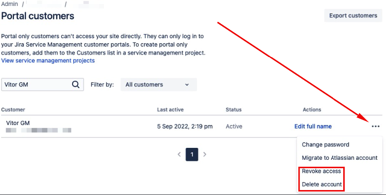 After reaching the Portal customers page, select the three-dotted icon in front of the corresponding user and select either Revoke access or Delete customer: