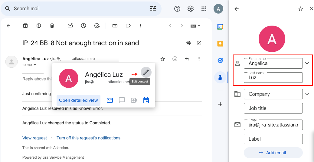 Customers or users may receive many emails from this address, but all triggered by one specific Jira/JSM agent. In turn, they might save the general mailing address as the JSM agent mistakenly. Using Gmail as an example, if a recipient selects Add to Contacts, this will automatically add the agent’s name.
