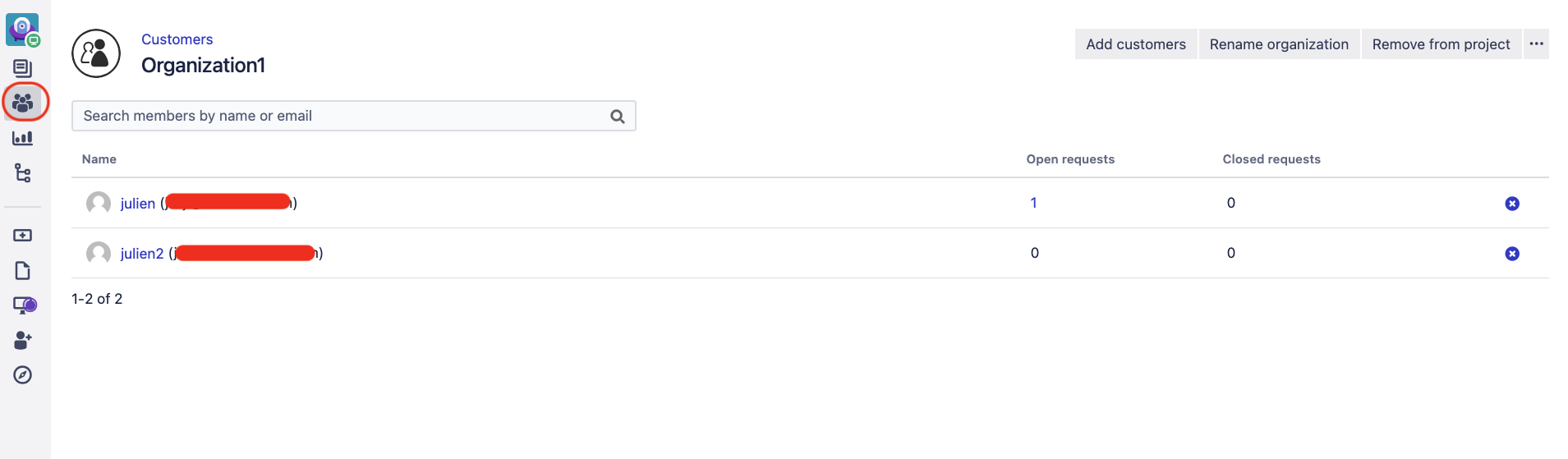 In the same project, go the Customers page. Check if the user who is unable to search for other users (user julien in the example above) on the customer portal is part of an organization
