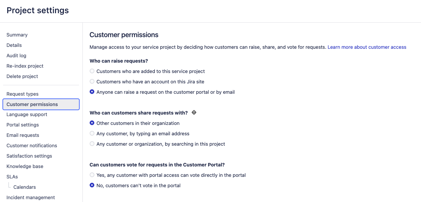 Set Who can customers share requests with? to Any customer or organization, by searching in this project.