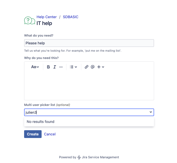 If this user part of an organization, check if the user that cannot be found in the request creation form (user julien3 in the example above) is missing from that organization. If that's the case, then this KB article is relevant and you can move on to the Cause and Solution sections