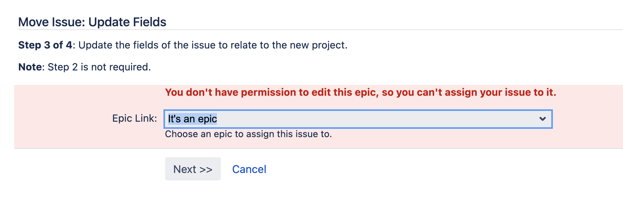When selecting a new project in the move operation, the user will be forced to set a new value for the Epic Link or the field will be cleared