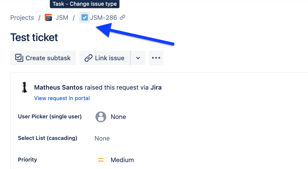 To validate that, access the ticket and see the name of the Issue Type by hovering the mouse over the icon:
