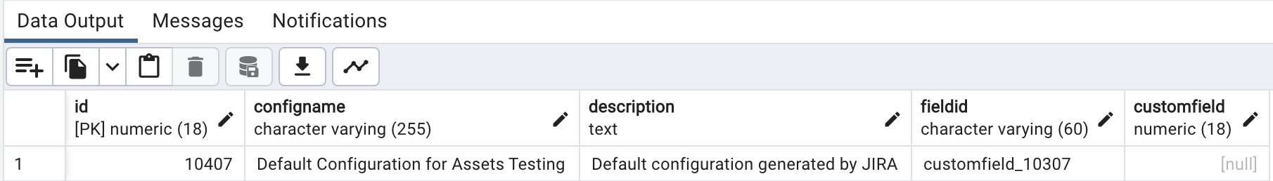 SELECT * from fieldconfigschemeissuetype where fieldconfigscheme = '<impacted_id>'; SELECT * from fieldconfigschemeissuetype where fieldconfigscheme = '10801'; --> In our testing impacted fieldconfigscheme id is 10801.Observe the missing value for 'issuetype' in below screenshots, we need to update one of the issuetype id's to fix this gap. We used the id '10004' used in other context which is 'Bug'.