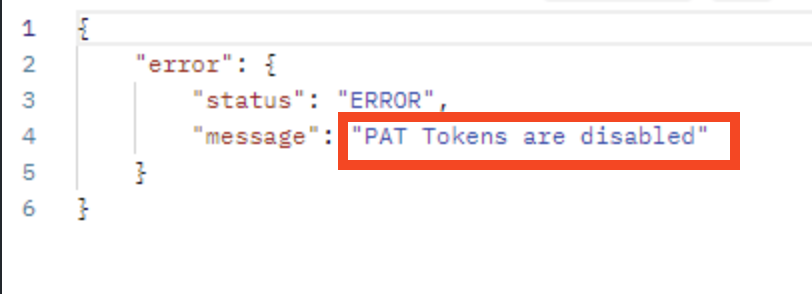 2024-06-25 16:10:43,434+1000 http-nio-82-exec-19 ERROR anonymous 970x586299x1 - 10.20.xx.xx /rest/api/2/myself [c.m.r.a.commons.handler.ApiKeyAuthenticationHandler] No user foundOn the user end, getting the "PAT tokens are disabled" error as shown in below screenshot: