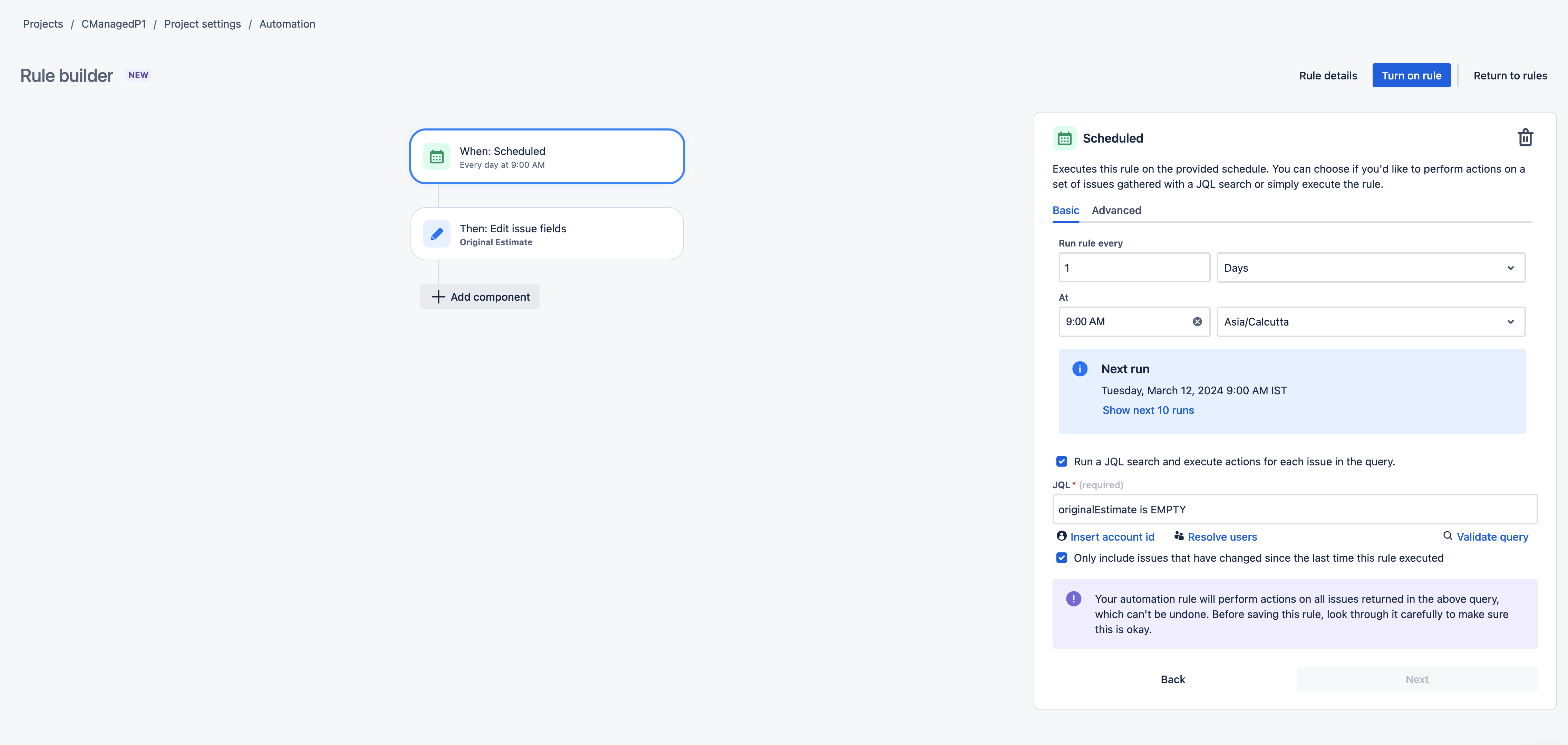 Once you create the automation, click on the Turn on the rule button press on the Run rule button, and check the audit log to view the execution of the automation rule.