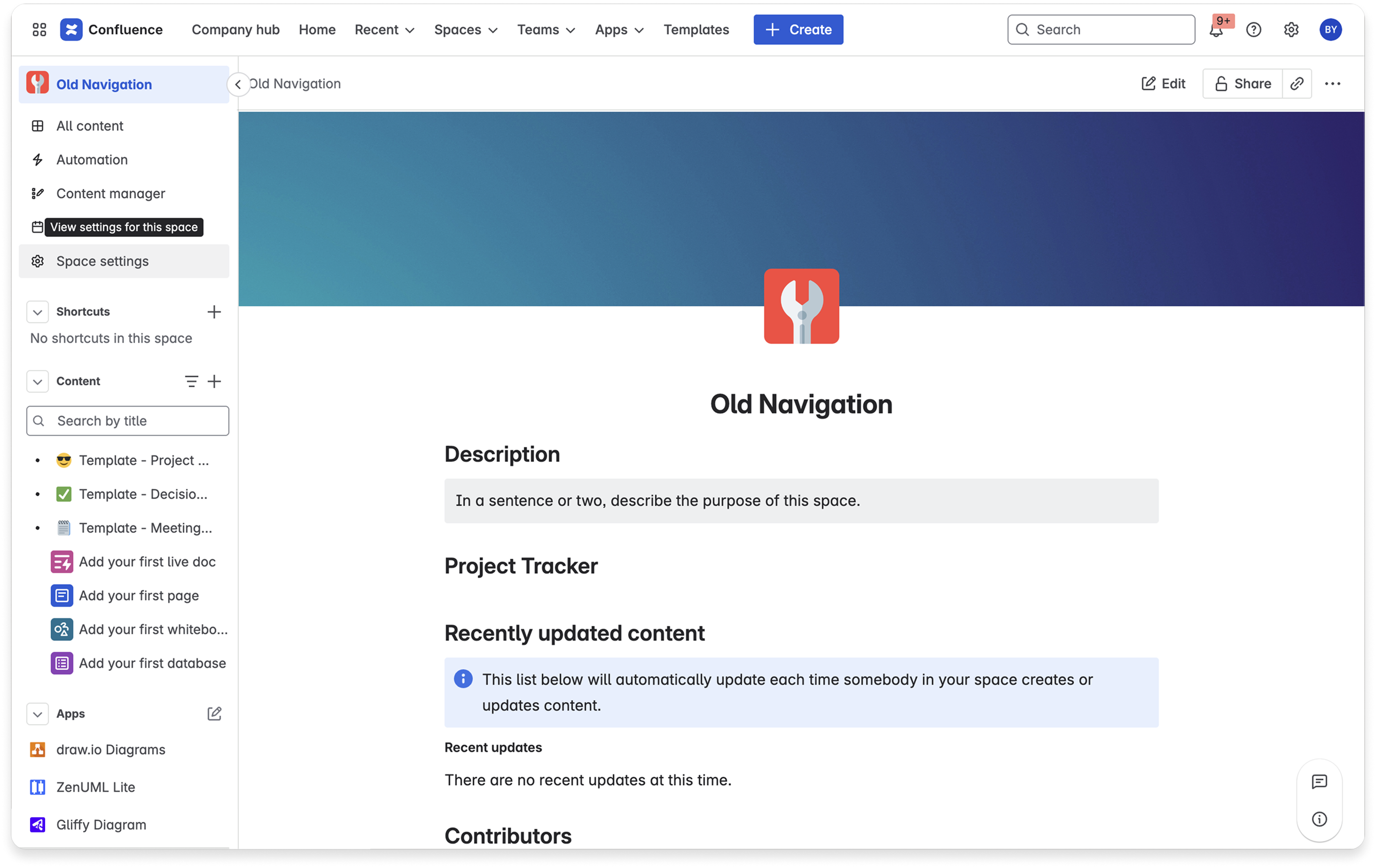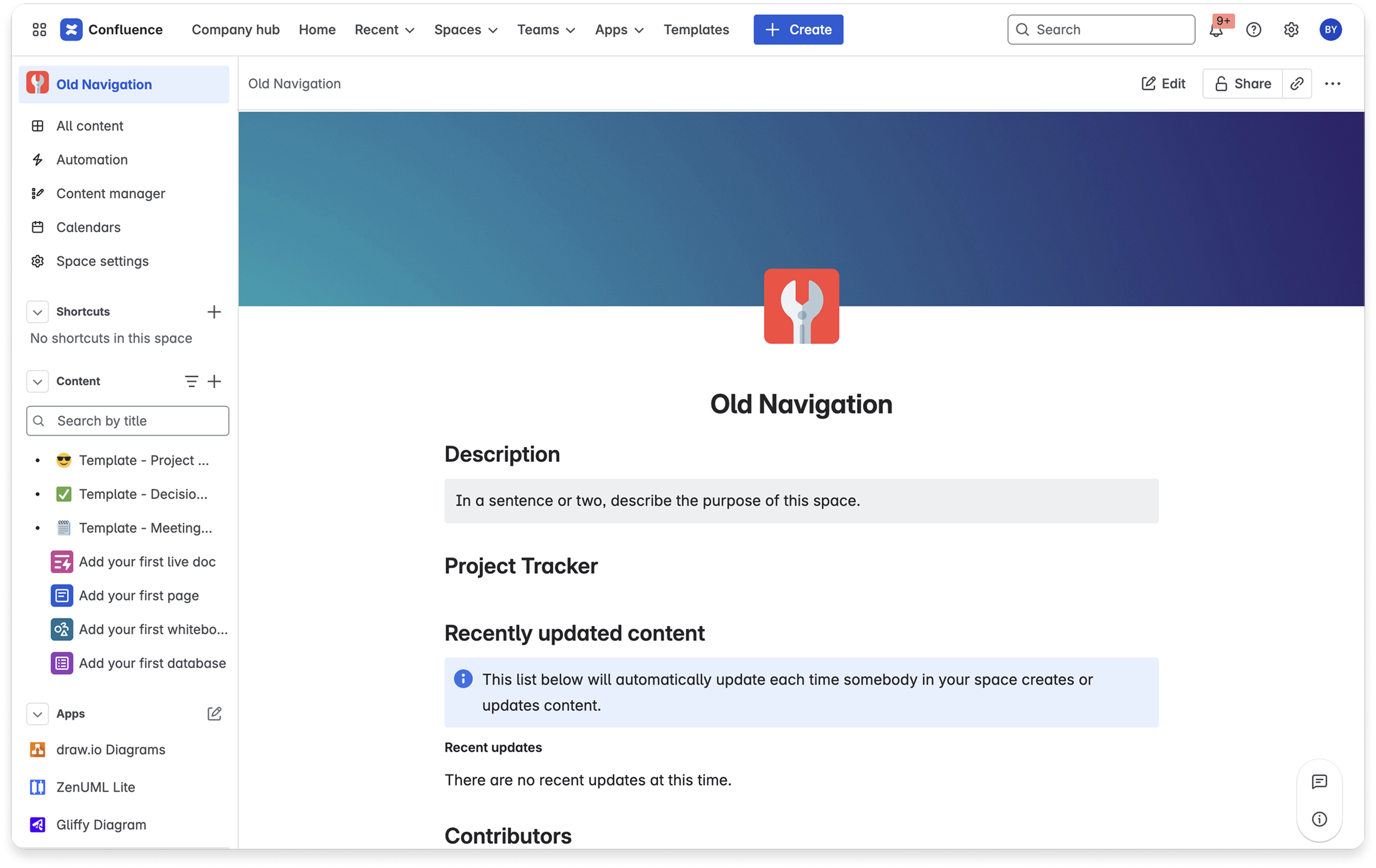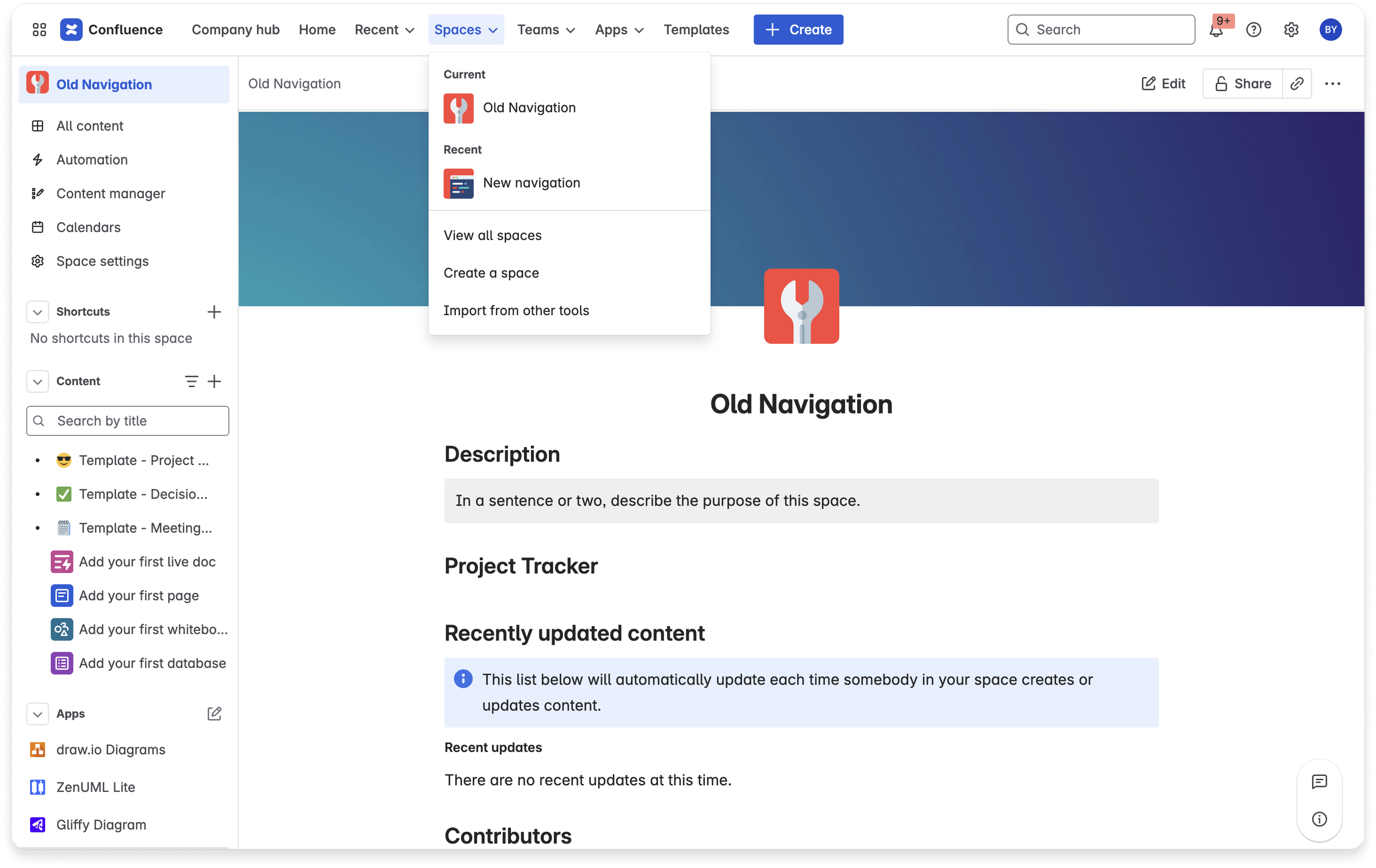 Confluence’s navigation has been updated to make it simpler and more consistent across Atlassian products. If you’re used to the old navigation, this table will help you get up to speed by showing exactly what’s changed.