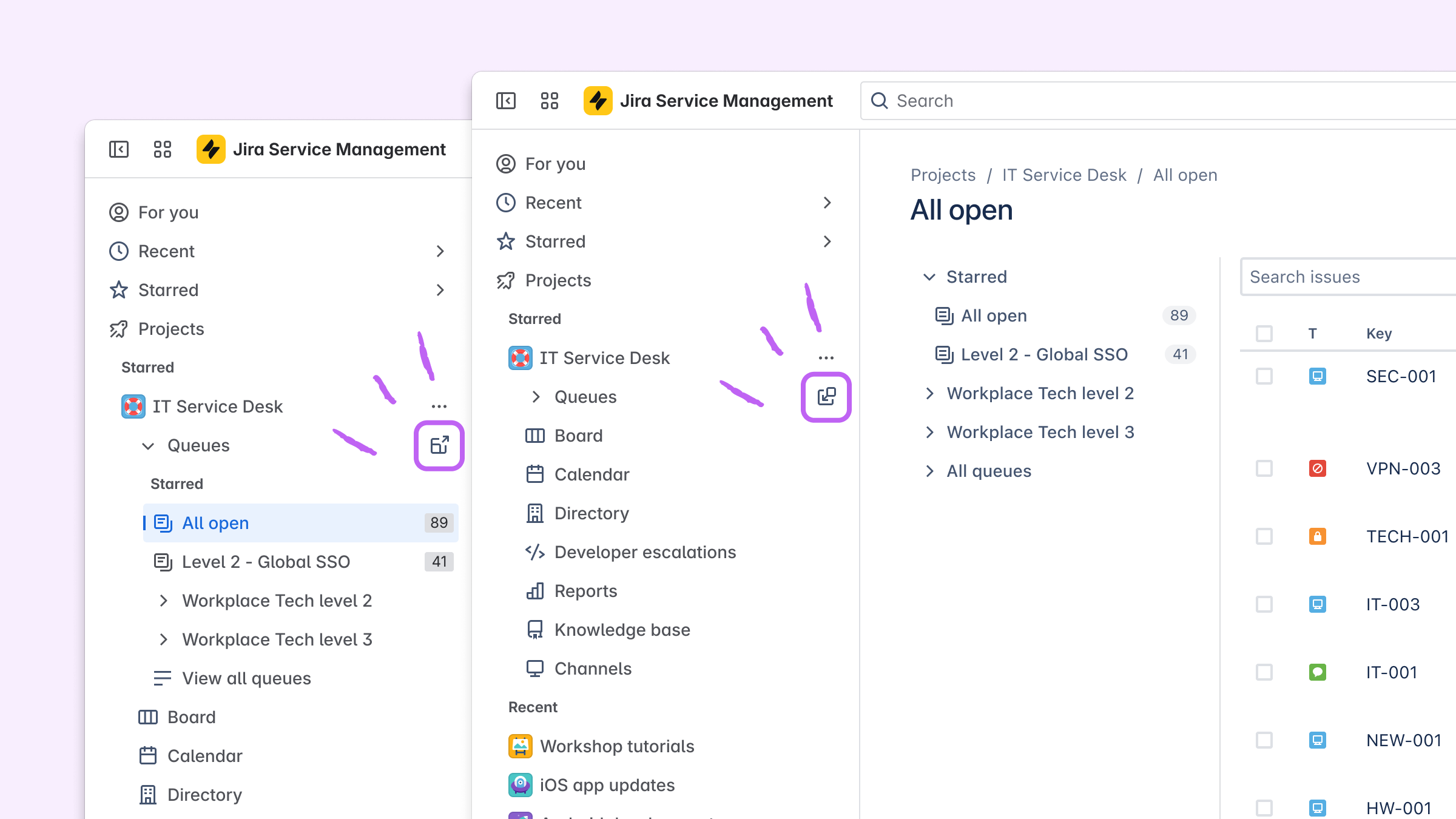 By detaching queues from the main sidebar, you can free up navigation space while keeping queue access front and center. This also allows you to view your queues when your sidebar is collapsed. To pop out your queues, hover over queues and select Pop out from sidebar.