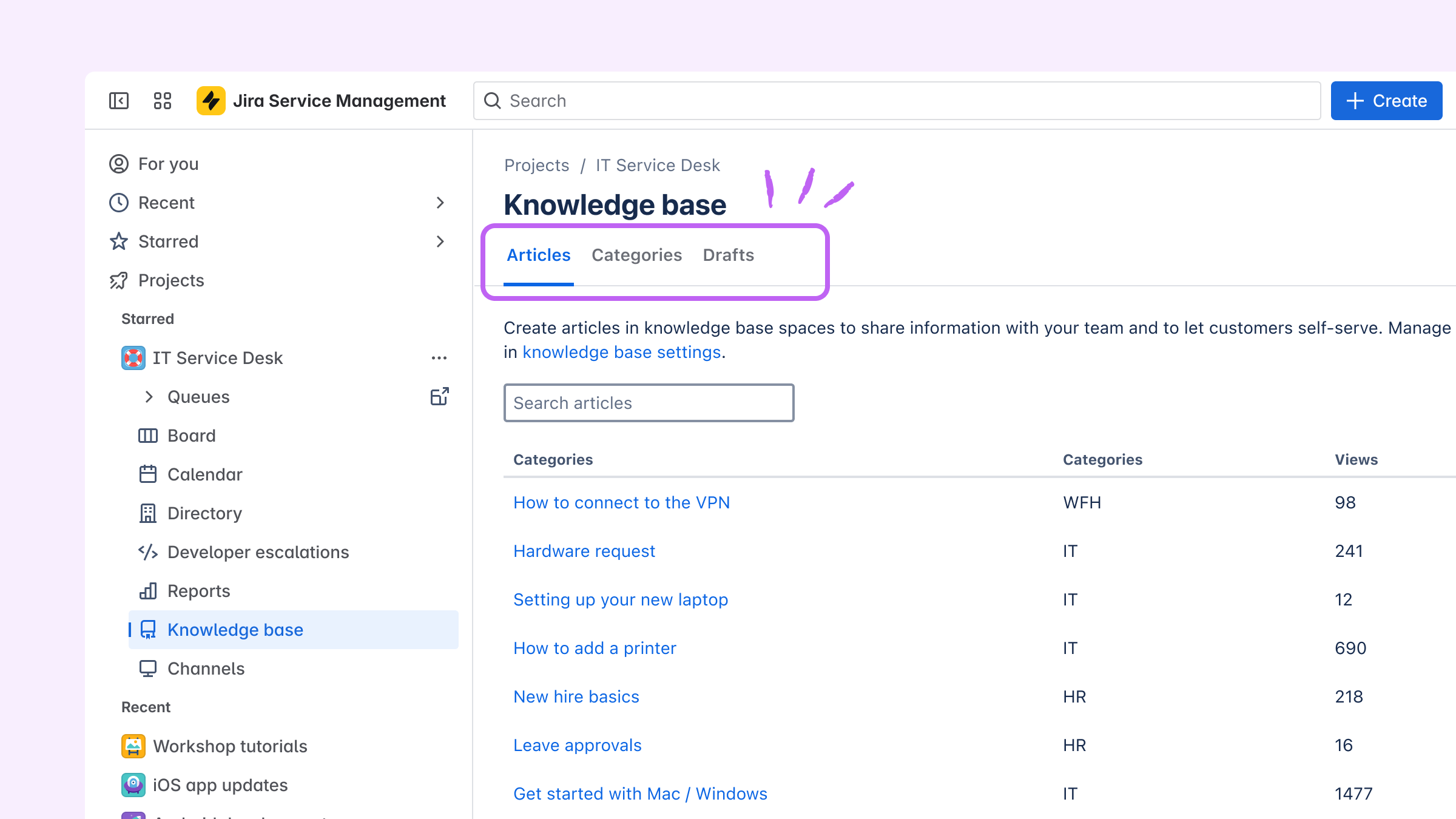 Recent: Spaces, queues, requests, and more that you’ve visited, edited, or created.