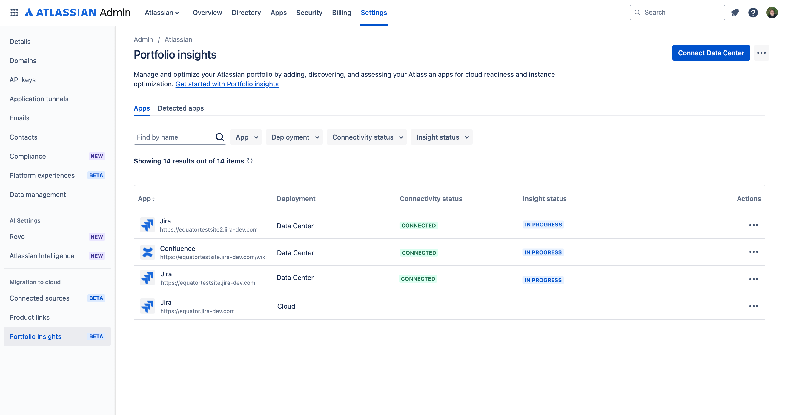 In the Apps tab of Portfolio insights, select your Data Center instance.