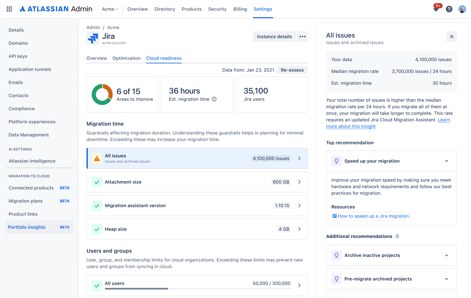 Your cloud readiness report compares data from your instance with Atlassian guardrails that are relevant for migrations or your future setup in cloud.