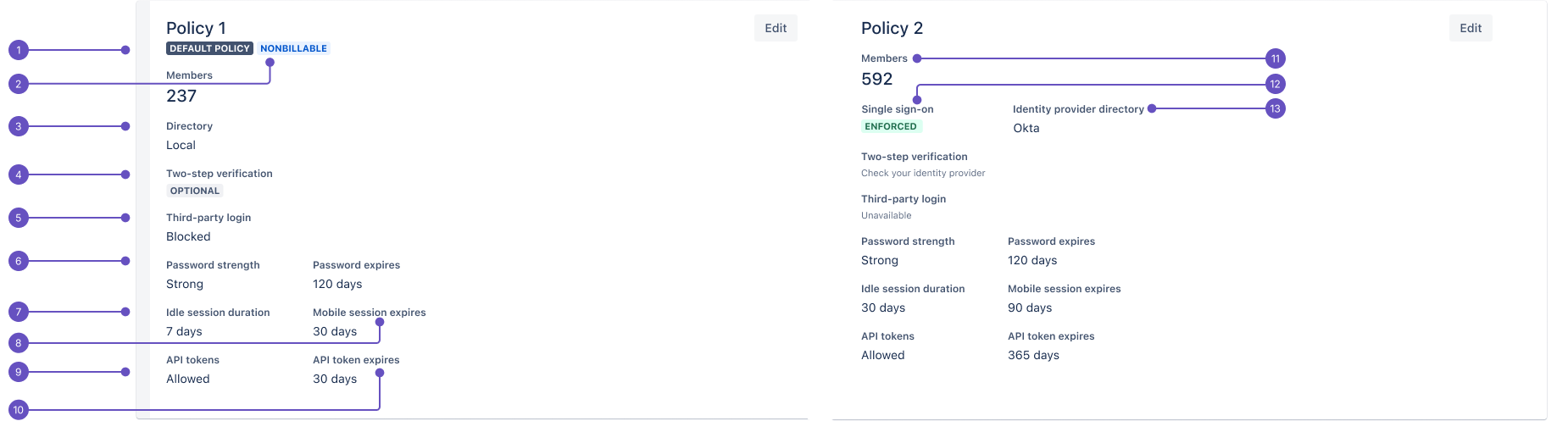 Each authentication policy lists key settings that define how users in that policy authenticate when signing in to Atlassian apps.
